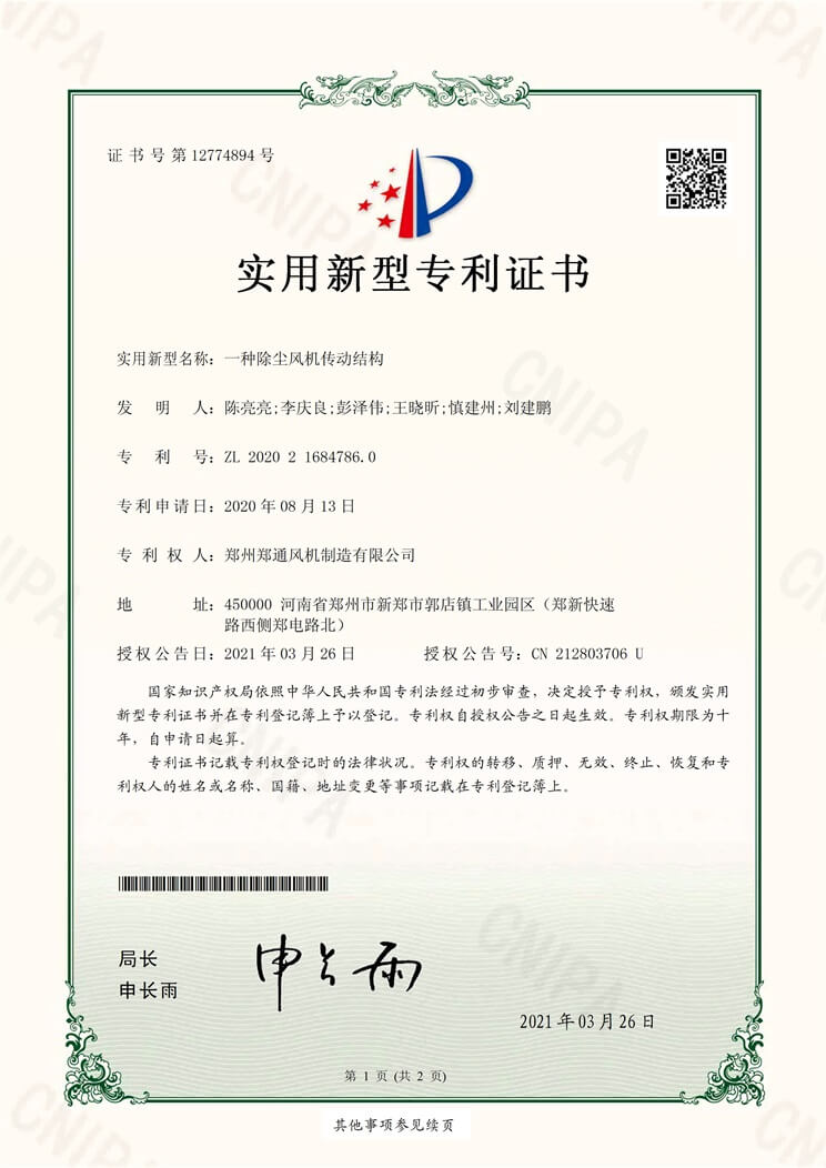 一種除塵風機傳動結構實用新型專利證書